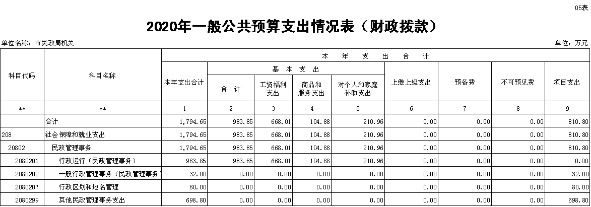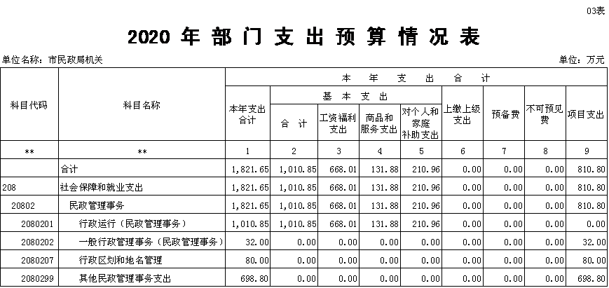 我单位2020年财政补助拨款1821.65万元,其中基本支出1010.85万元(工资福利支出668.01万元,商品和服务支出131.88万元,对个人和家庭补助支出210.96万元),项目支出810.80万元。基本支出安排如下:150.99万元用于发放在职在编人员基本工资,120.66万元用于发放津贴补贴,215.21万元用于发放奖金及13月工资,114.97万元用于基本养老保险及医疗保险缴费,61.76万元用于住房公积金,4.42万元用于聘用及以钱养事人员工资;98.72万元用于日常公用支出,33.16万元用于职工福利;34.42万元用于离休费,168.41万元用于退休人员经费,8.13万元用于医疗费补助。项目支出安排如下:民政工作经费32万元,区划地名工作经费80万元,高龄老人生活津贴650万元,精简退职人员生活费、医疗费12万元,社会组织审计及公告管理等工作经费28.8万元,市慈善总会补助工作经费8万元。