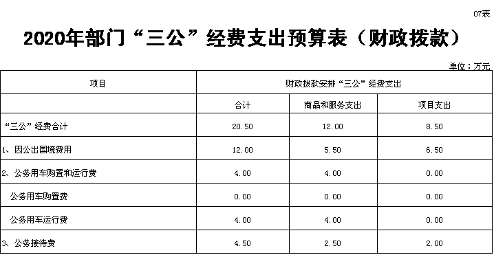 我单位2020年三公经费预算为20.5万元,较2019年19万元增加了1.5万元。其中因公出国(境)费用为12万元,比上年6.5万元增加5.5万元,主要是2020年我单位预算有一次因公出国业务;公务用车运行费为4万元,比上年8万元减少4万元,主要是因公车改革,我单位公车数量减少了一台;公务接待费4.5为万元,与上年持平。