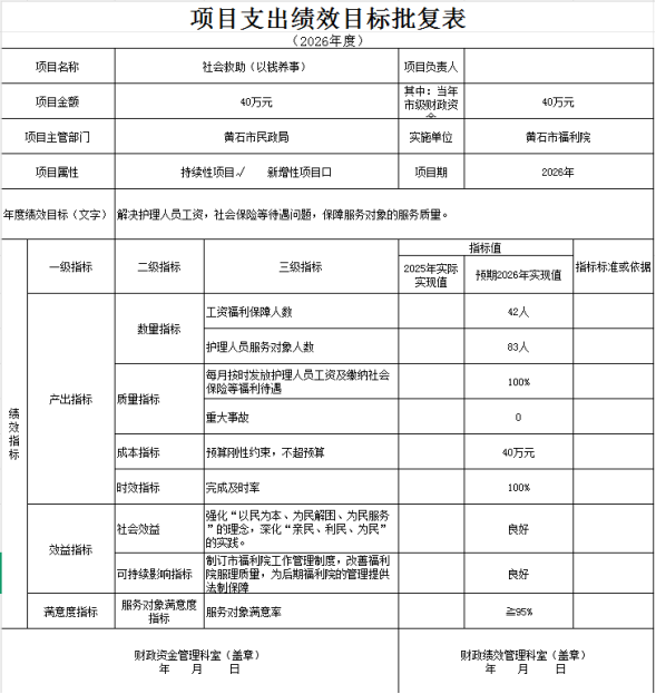 (7)2026年度项目绩效总目标是:该项目资金用于弥补老年人服务工作经费不足部分,加强福利机构建设,提升老年人集中供养工作质量。