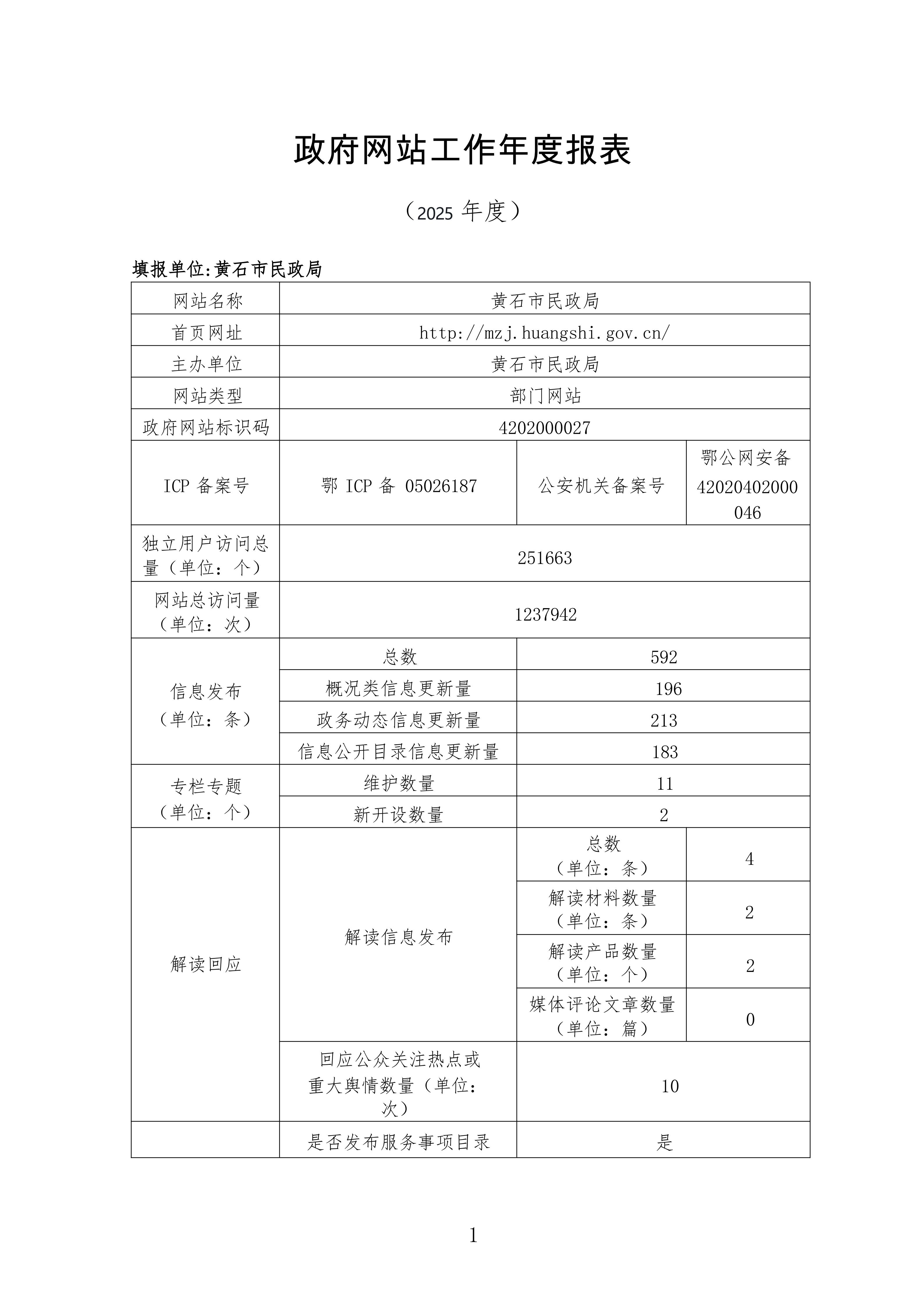 黄石市民政局政府网站工作年度报表 (2025 年度)
