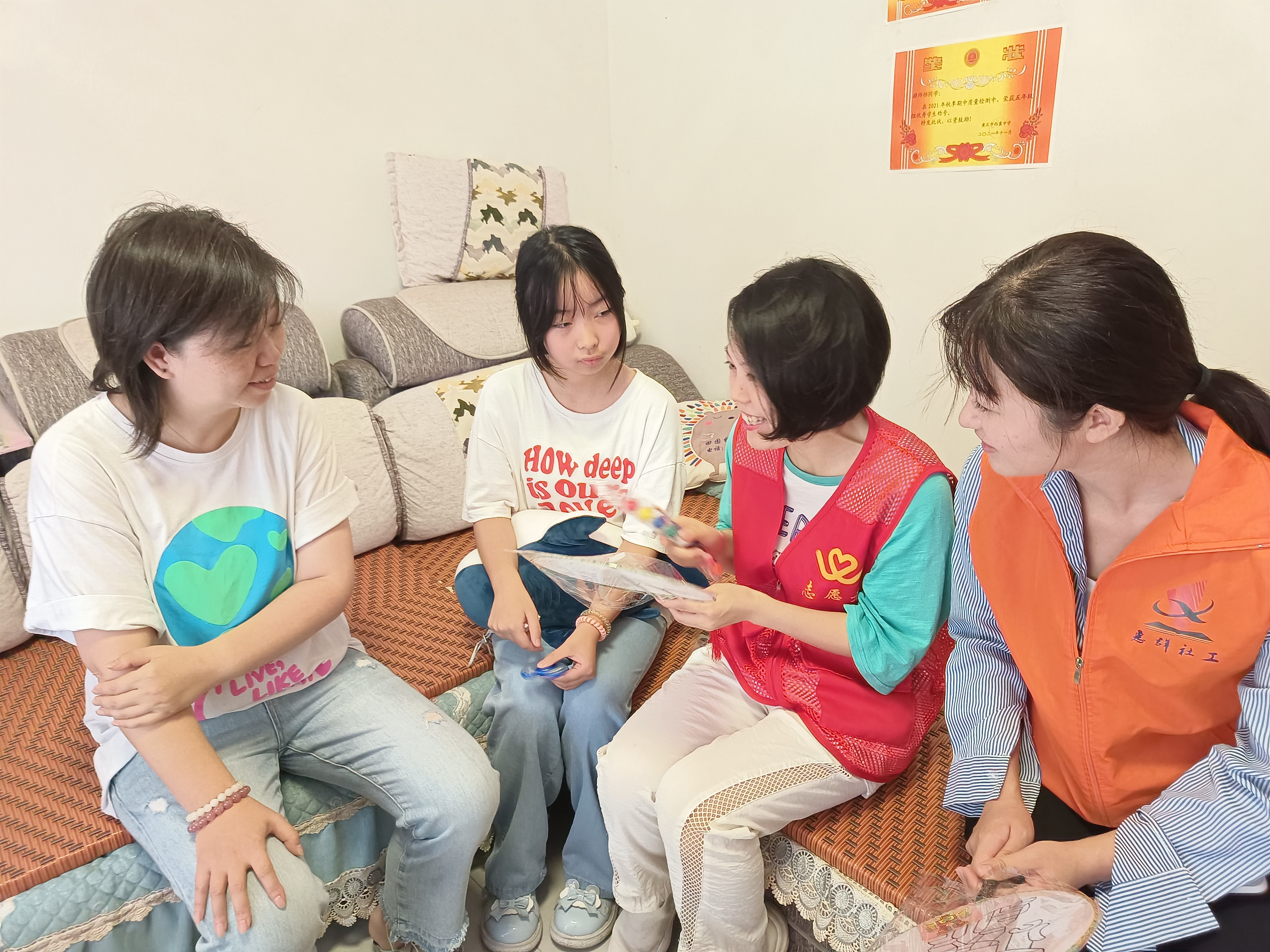 近日,市民政局组织志愿者赴西塞山区部分留守儿童家中开展志愿服务活动。志愿者们通过同留守儿童一起画画、制作卡牌,迅速拉进与留守儿童的距离,进一步了解留守儿童学习、生活中的实际情况,缓解父母不在身边的孤独感,鼓励留守儿童体谅父母,努力学习知识文化,力争做社会有用人;志愿者们还悉心教授留守儿童叠衣叠被,打扫家务等技能,鼓励留守儿童帮助家中爷爷奶奶做些力所能及的事情,提升自己的劳动能力,短短几个小时的陪伴,让留守儿童切实感受到了家庭的温暖,脸上堆满笑容。